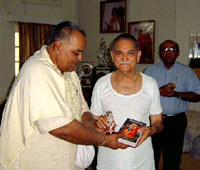 The next day, the devotees went to visit the Honorable Deputy Prime Minister, Sri Lal Krishna Advani. Although he was quite busy, on hearing that Janmastami Prasad from Vrindavan had come, he made an appointment to meet the devotees. On their invitation to visit Vrindavan, he lamented that he really wanted to come, but everywhere he goes the security makes so much inconvenience for the public. He said that he didn't want to trouble anyone who was coming to Vrindavan to take darshan of Lord Krishna. He was very happy when the devotees suggested that we could make arrangements in the slow season.